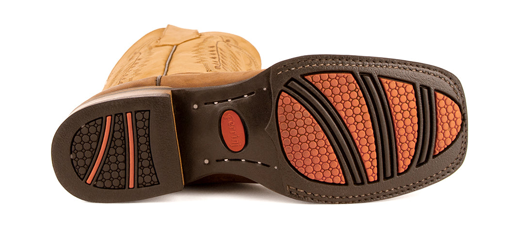 Ferrini’s RidgeFlex sole is cowboy tested, cowboy approved. The slimmer ridges won’t hang up on stirrups. The non-skid texture offers sure-footed traction. And the look is right, on or off the ranch.